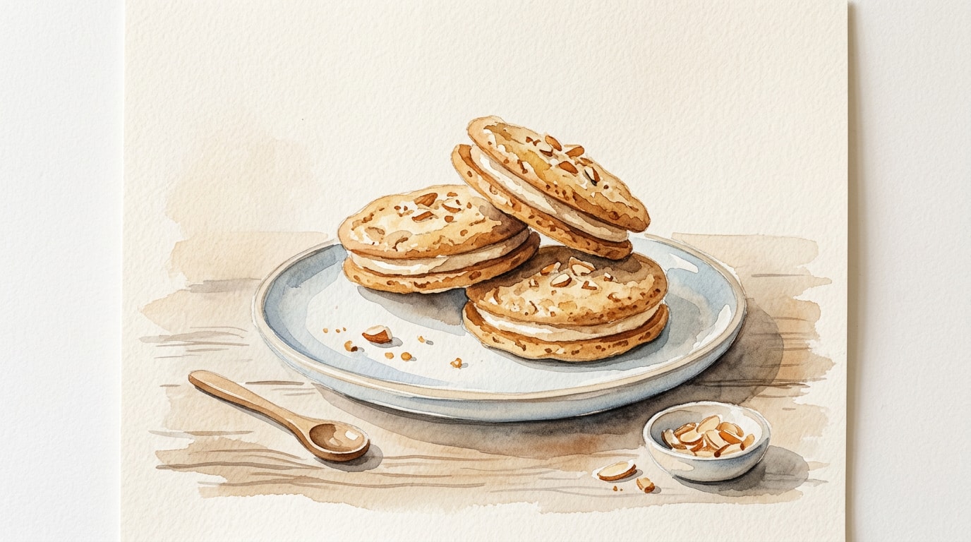 Spread or pipe a small dollop of the brown butter icing onto the flat side of an un-almonded cookie base, then gently press an almond-topped cookie onto the icing to form a complete sandwich.