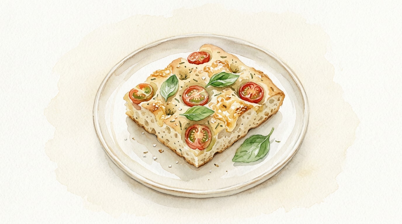 Bake the focaccia in the preheated 220C/425F oven for 20 to 25 minutes. The bread is done when the top is deeply golden brown, the cheese is toasted and crisp, and the internal temperature reaches 90C/190F.