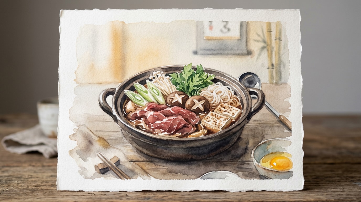 Serve the hotpot directly from the stovetop. Diners dip the hot meat and vegetables into the raw egg before eating. Once most ingredients are eaten, add the pre-cooked udon noodles to the remaining broth to simmer for 2 minutes and absorb the flavors.