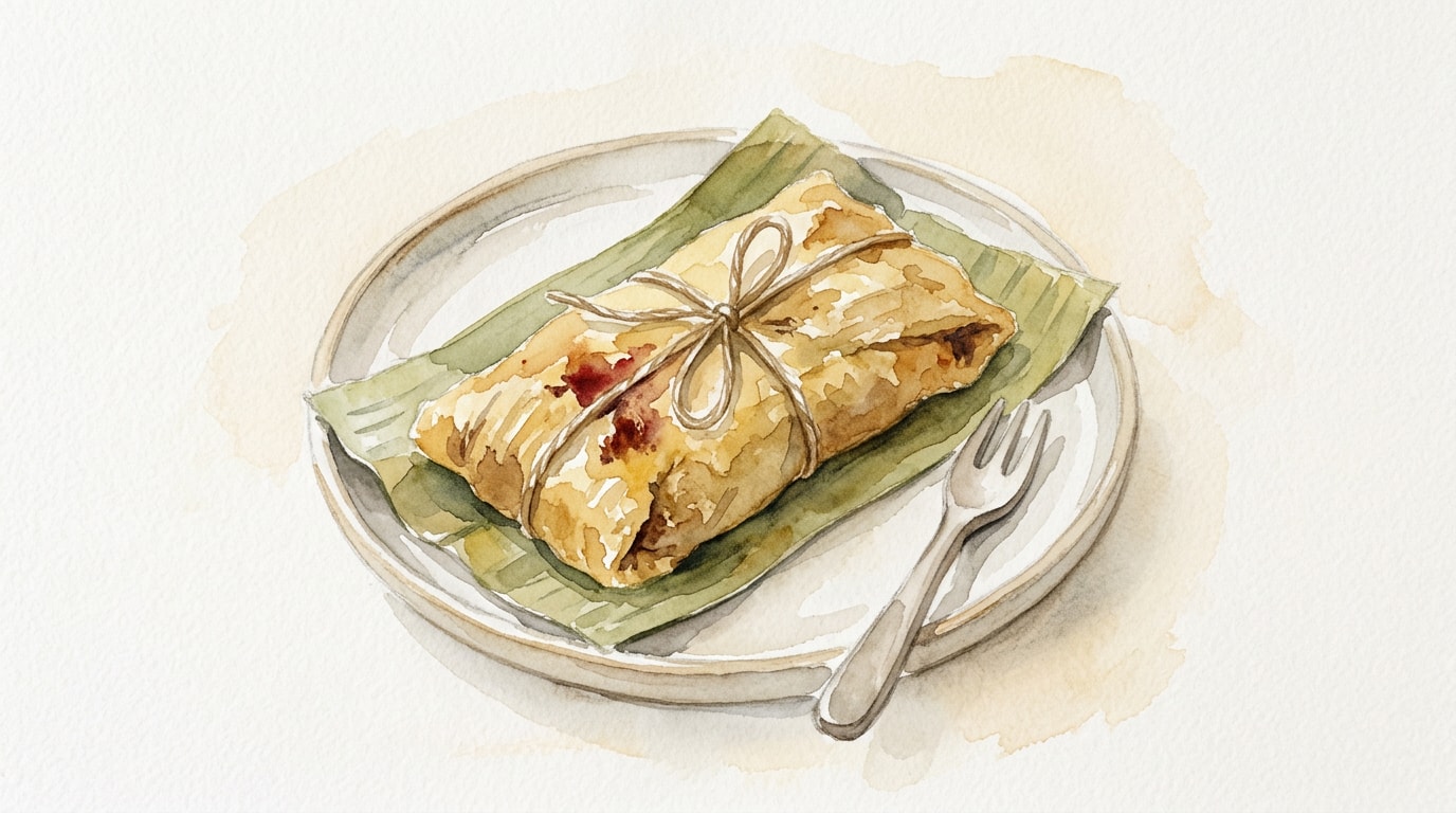 Fold the top and bottom edges of the banana leaf and parchment over the filling so they overlap, creating a tight rectangular packet. Fold the ends securely underneath. Tie firmly with butcher twine, crossing the string in the center like a traditional gift parcel.