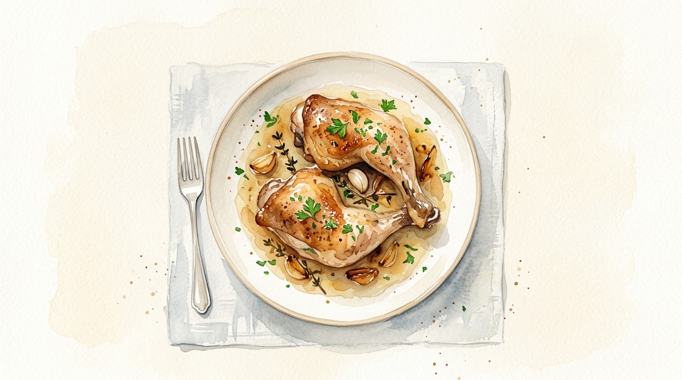 Stir in the chicken broth and fresh thyme sprigs. Return the seared chicken legs to the pot, nestling them into the liquid along with any resting juices accumulated on the plate. Bring the liquid to a gentle simmer.