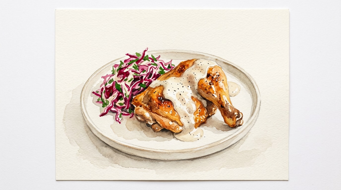 Carve the rested chicken and serve alongside the vibrant red slaw. Drizzle the chicken generously with the white BBQ sauce, or serve it on the side as a dipping sauce.