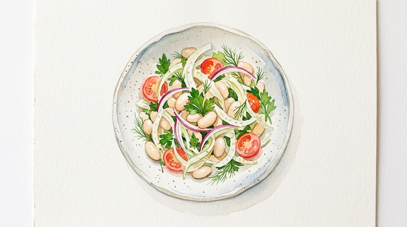 In a large mixing bowl, combine the thoroughly rinsed cannellini beans, sliced fennel, diced celery, chopped red onion, and fresh dill.