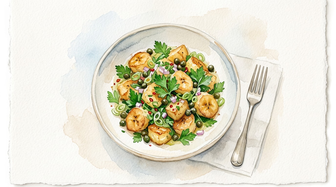 Add the drained capers, finely diced red onion, and chopped cilantro to the bowl with the cubed plantains. Pour the emulsified lemon-curry dressing over the top and gently toss until all ingredients are evenly coated.