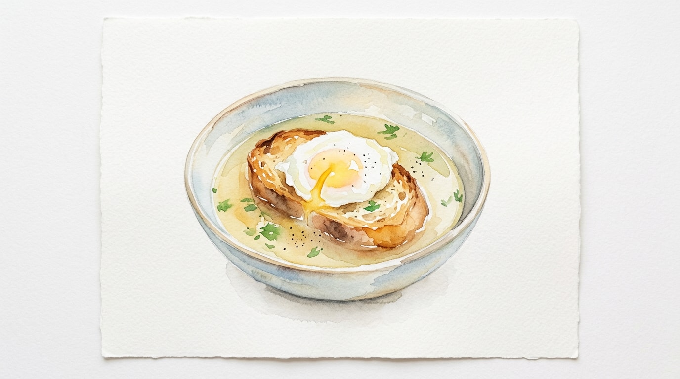 - For an intensely traditional and rustic method, you can place the raw egg directly onto the toast in the bowl, cover it with cheese, and pour vigorously boiling broth straight over the yolk to lightly cook it in the bowl.